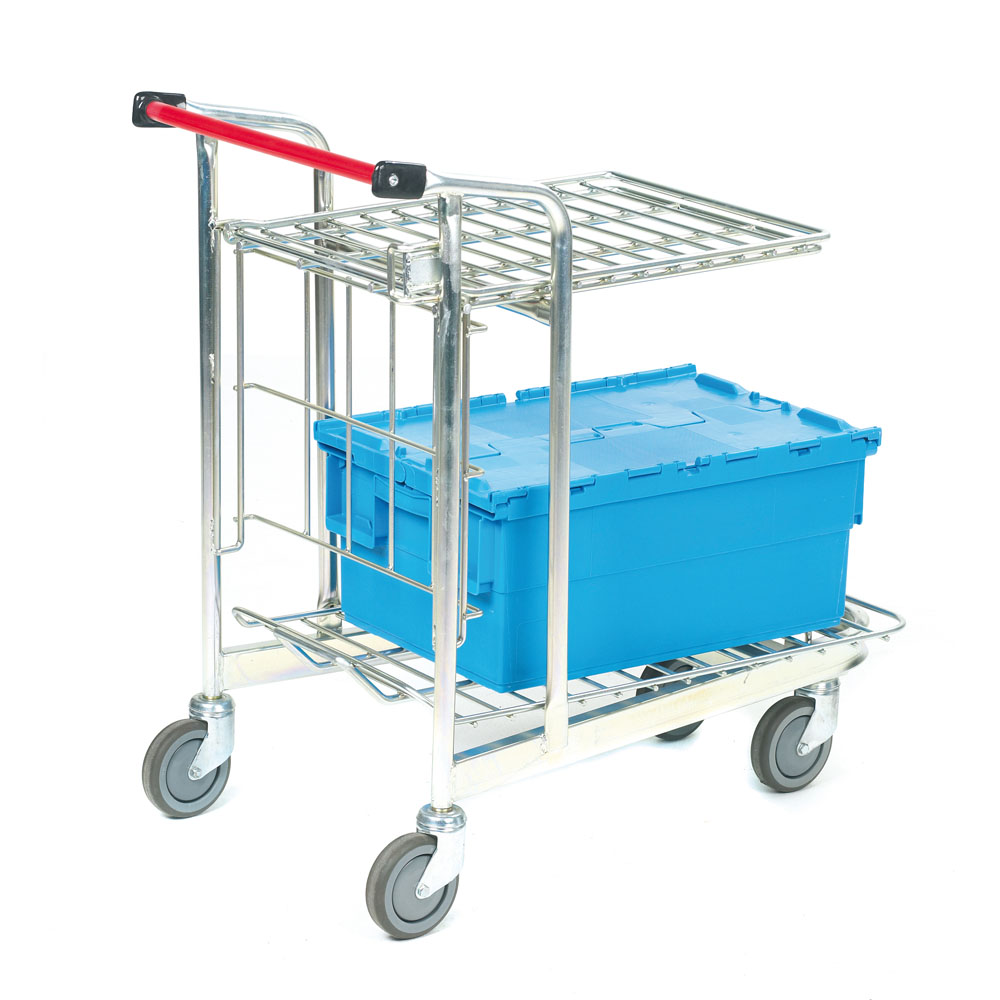 Manufactured from robust materials, this Stock Trolley features a solid frame with an integrated handle, a generous platform for heavier items, and a fold down top shelf that can be used to transport smaller items, and folded down when not required. Fitted with 4 swivel rubber castor wheels, it glides across smooth floor surfaces with ease.